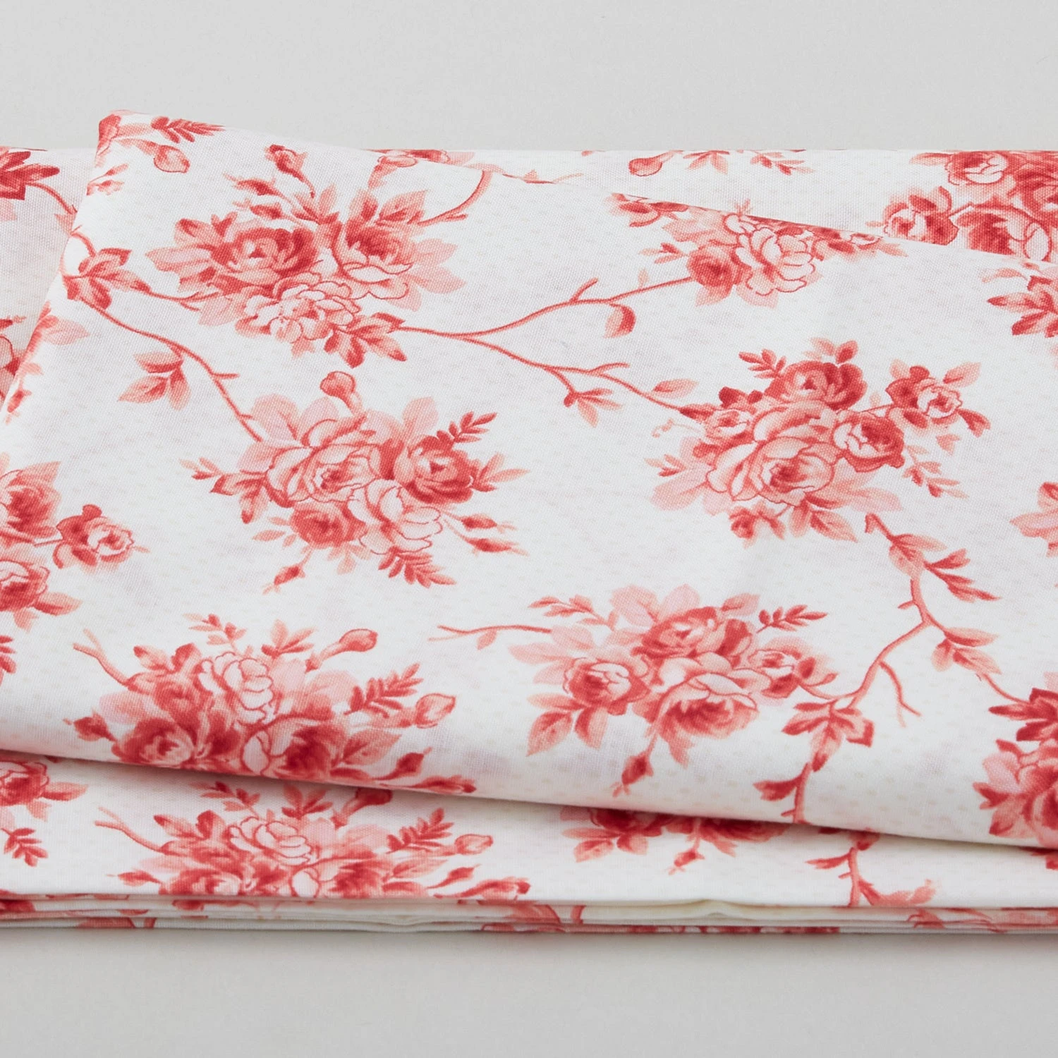 A 2-yard cut of red climbing roses on a white background with pale red dots. Romantic florals, paisley, dots, and more can be found in Maywood Studio American Beauty Favorites. These pretty prints would be perfect in nearly any project!
