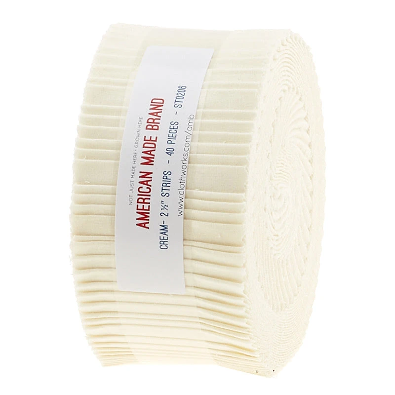 Jelly roll of solid cream 2.5″ strips. American Made Brand Cotton Solids by Clothworks are just that, American-made. Grown, woven, and dyed just for you right here in the USA, these quality cotton fabrics come in an impressive array of solid colors. Each shade is just as gorgeous as the other, so don’t be surprised if you find yourself wanting them all!