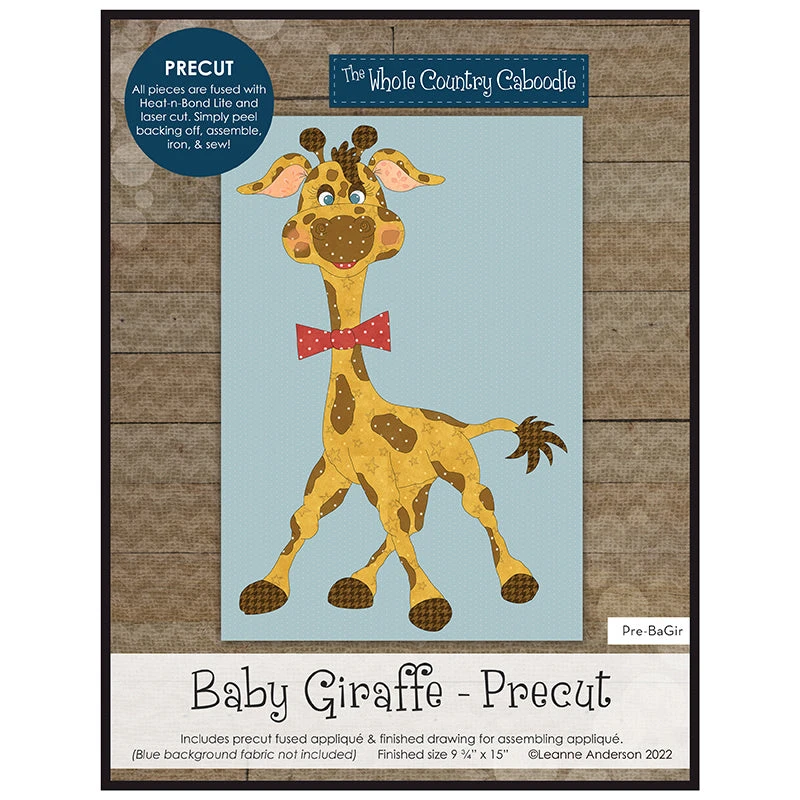 Make this adorable baby giraffe appliqué easily with a precut fused appliqué pack. Decorate any project, or make the appliqué as part of the Whole Country Caboodle’s “Our Greatest Gift” appliqué quilt. Pack includes precut, fused appliqué and finished drawing for assembling the appliqué. Background fabric is not included. A pressing sheet will help to keep your iron clean and protect your fabric when fusing the appliqué.