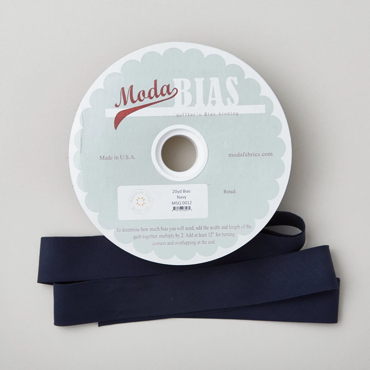 20 yards of navy bias binding. Finish your quilts faster with premade bias binding! Together Missouri Star and Moda Fabrics have created a 20 yard spool of 100% cotton Moda Bella Solid fabric. Start a bias binding stash with these 2-1/4” single fold bias bindings.