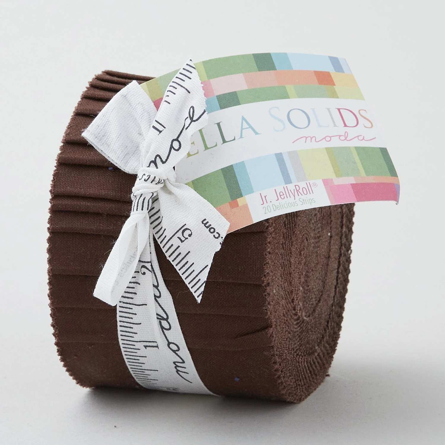Junior jelly roll of Bella solid brown 2-½” strips. Solids are fantastic because of the balance they bring to quilts! If you need to balance out your project, consider Bella solids from Moda Fabrics! When it comes to Bella, you’ll always find the color you need, whether it’s sangria pink or lemon yellow.