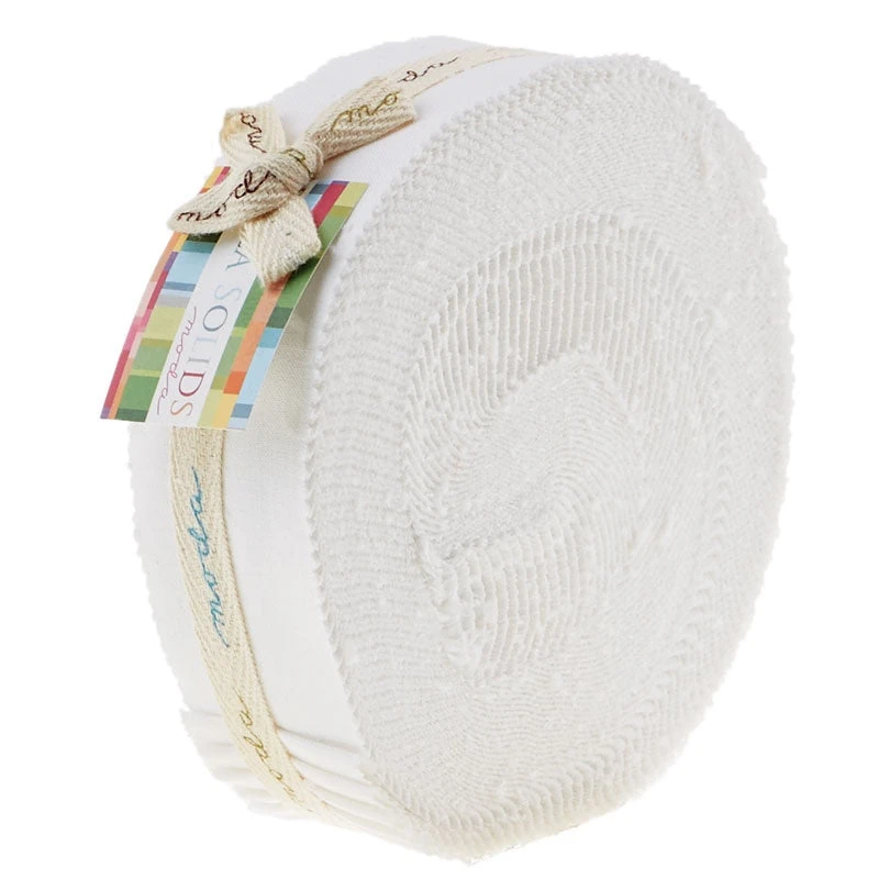 Honey bun of Bella solid white 1-½” strips. Solids are fantastic because of the balance they bring to quilts! If you need to balance out your project, consider Bella solids from Moda Fabrics! When it comes to Bella, you’ll always find the color you need, whether it’s sangria pink or lemon yellow.
