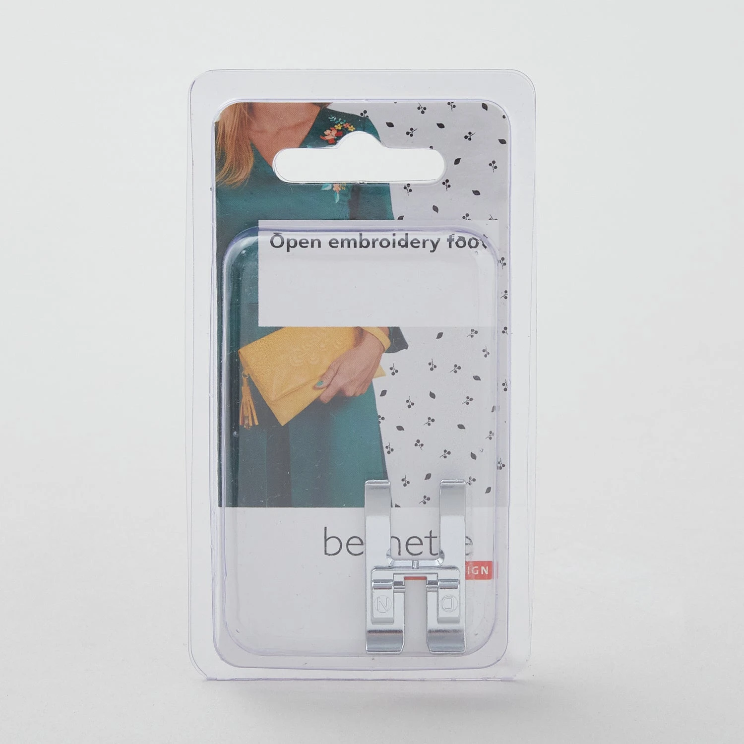 The Bernette Open Embroidery Foot for Dual Feed makes quick work of appliqués and embroidery projects. The open shape ensures a clear view of the seam, making it easy to sew on tapes and ribbon and sew over lines and patterns. The dual feed function ensures a consistent feed of multiple layers and difficult-to-feed fabrics. Fits Bernette models b79/b77.