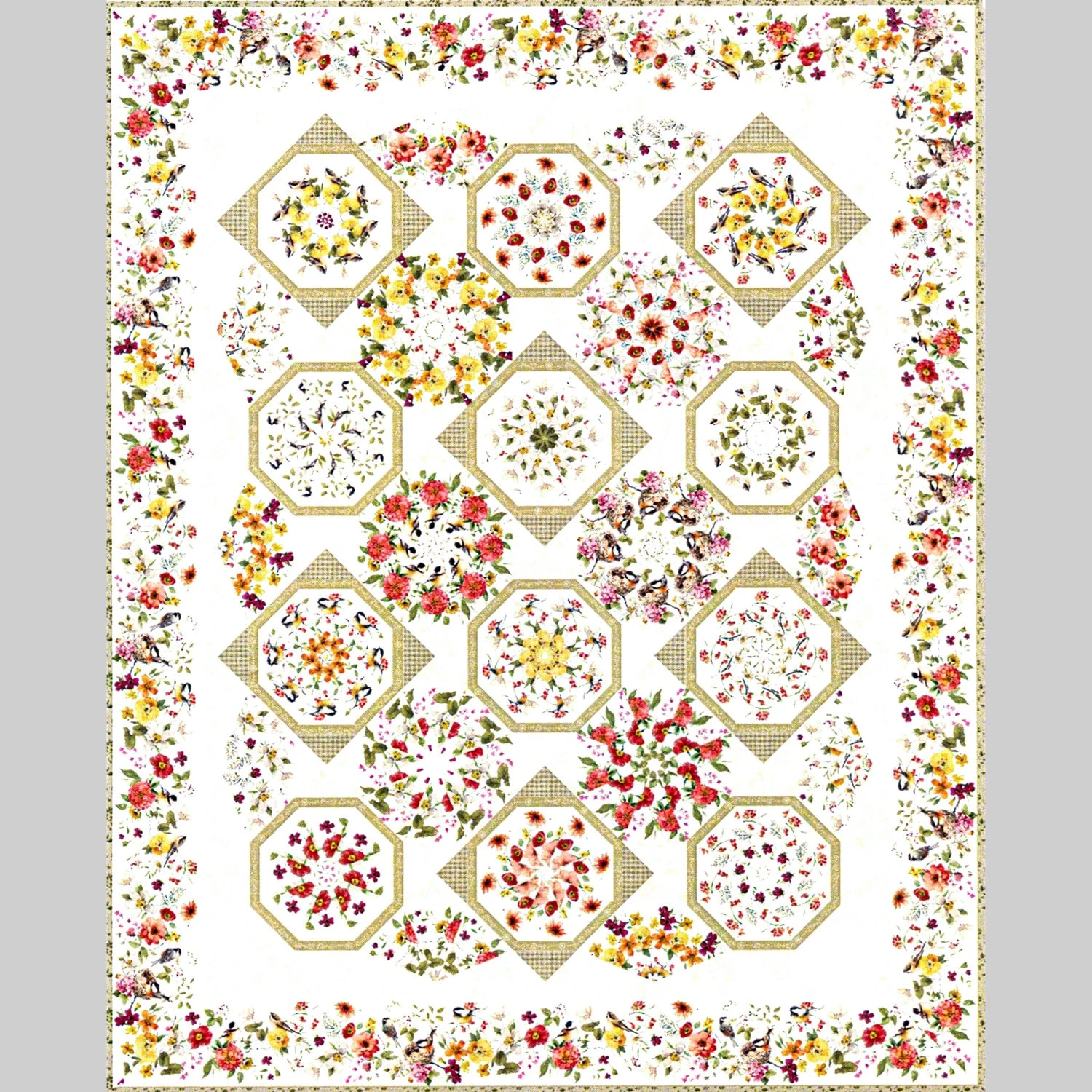Bless your home with the whimsical beauty of this amazing quilt. Blessed by Nature from Wilmington Prints is a stunning pieced quilt that features a combination of octagon and diamond blocks in floral fabrics. This would be the perfect spring time project, especially for quilters who love floral prints.