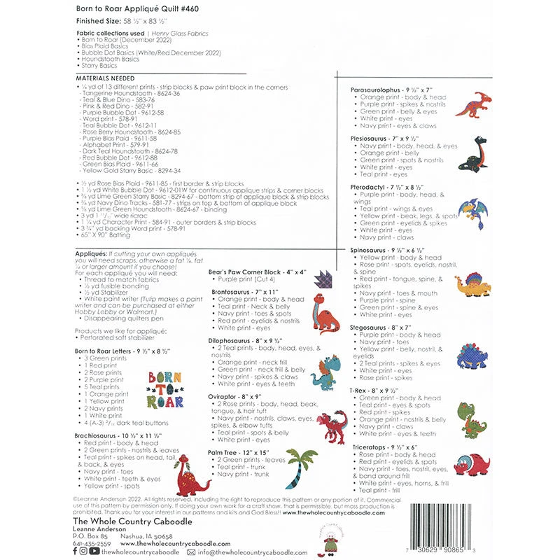 Roar, baby! This adorable quilt featuring playful juvenile dinosaurs would be perfect for your little dino-mo! The Whole Country Caboodle pattern includes instructions to make the quilt and patterns for 13 appliqués. Did you notice the pterodactyl up in the tree among the patches? It is fat-eighth and fat-quarter friendly, and it is a fantastic way to use up scraps in lots of different colors!