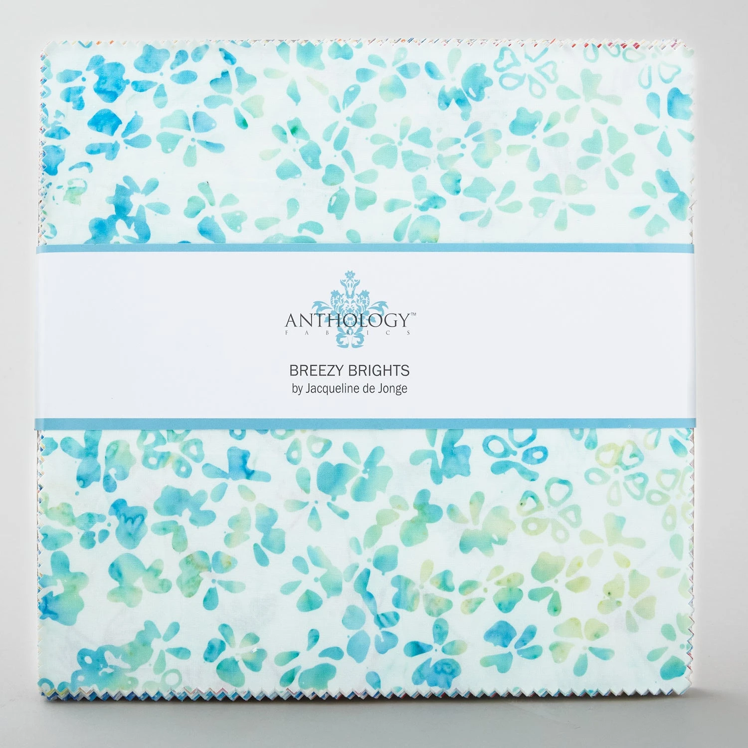 A layer cake of bright colors and floral patterns. Brighter with blooms! Breezy Brights by Jacqueline de Jonge for Anthology Fabrics is a bright batik fabric collection full of flowers, leaves, stripes, and more. Pair these batiks with your favorite complimenting solids to make these fabrics pop!
