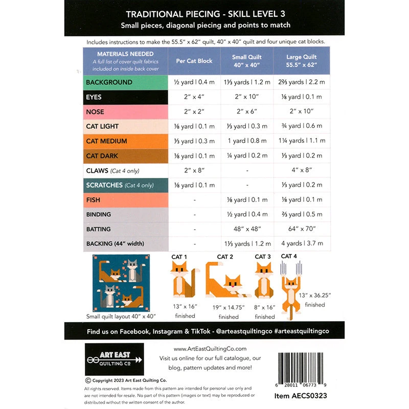Make this fun Cat Scratch quilt to show that you love your cats, claws and all! The Art East Quilting Co. 32-page pattern booklet provides instructions for piecing a 40” x 40” or 55 1/2” x 62” quilt. The cat blocks vary in size from 8″ x 16″ to 13″ x 36 1/4″. Construction of the quilt includes small pieces, diagonal piecing and points to match, and is appropriate for a confident quilter.
