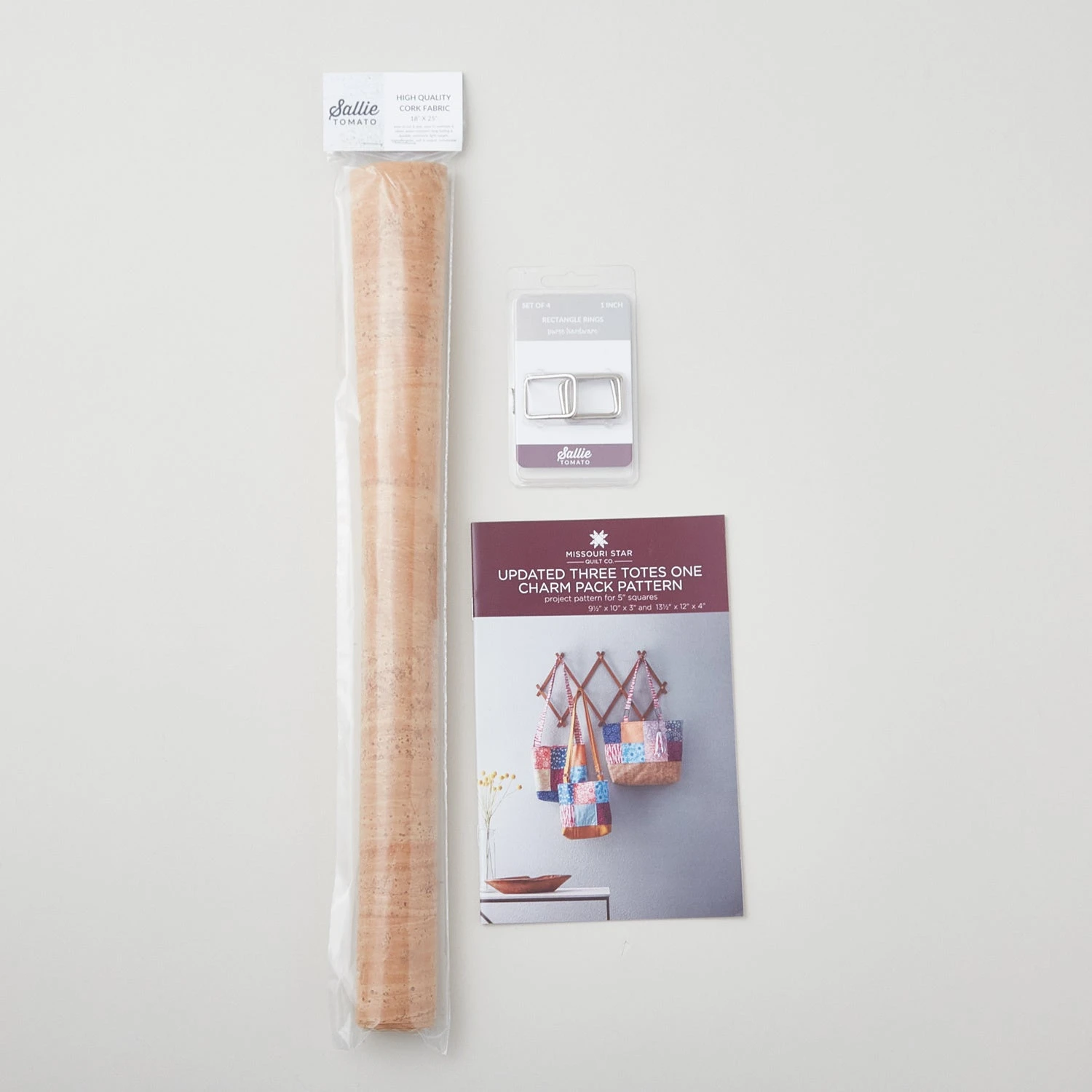 Get everything you need to make the Three Totes One Charm pattern right here! This bundle will save you shopping and sewing time because it includes all the main pattern components. Included is an updated version of the Three Totes pattern, a pack of 4 Sallie Tomato rectangle rings, and 1/2 yard of cork fabric.