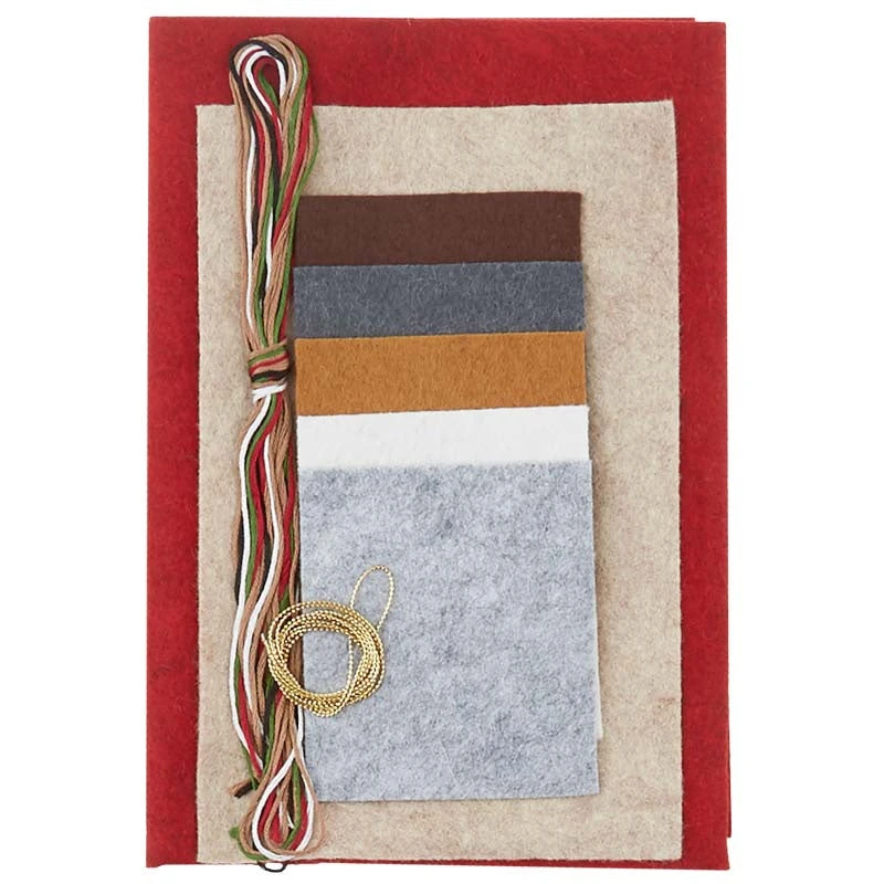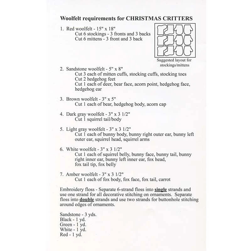 Celebrate the holidays with these adorable wool felt appliqué woodland critter ornaments. There are 3 mitten and 3 stocking ornaments with open tops to slip in a gift card. Kit, by Rachel Pellman, includes pattern, wool felt, cotton floss and gold string for six ornaments.