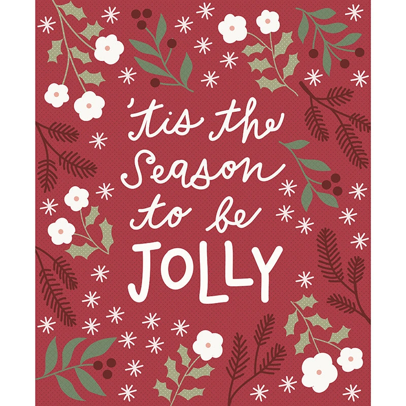 ‘Tis the Season to be Jolly fabric panel with holly, berries, Christmas roses, and snowflakes on a cranberry background. Christmas Eve brings celebration and anticipation! Let Moda help you celebrate the holidays with its Christmas Eve collection. With dots and stripes in classic holiday colors, yuletide plaids, evergreen sprigs, and more, you’ll find everything you need to make your Christmas projects merry and bright.
