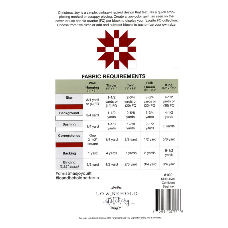 Whether you want to make a Christmas wall hanging or king-size quilt, you can create it with Christmas Joy by Lo & Behold Stitchery. The pattern has piecing instructions for five quilt sizes: Wall hanging 31″ x 31″, Throw 54″ x 71″, Twin 71″ x 88″, Full/Queen 88″ x 105″ and King 105″ x 105″. It features a quick, strip-piecing method or scrappy piecing. Create a two-color quilt, or use fat quarters of assorted colors and prints to create blocks of many different colors.