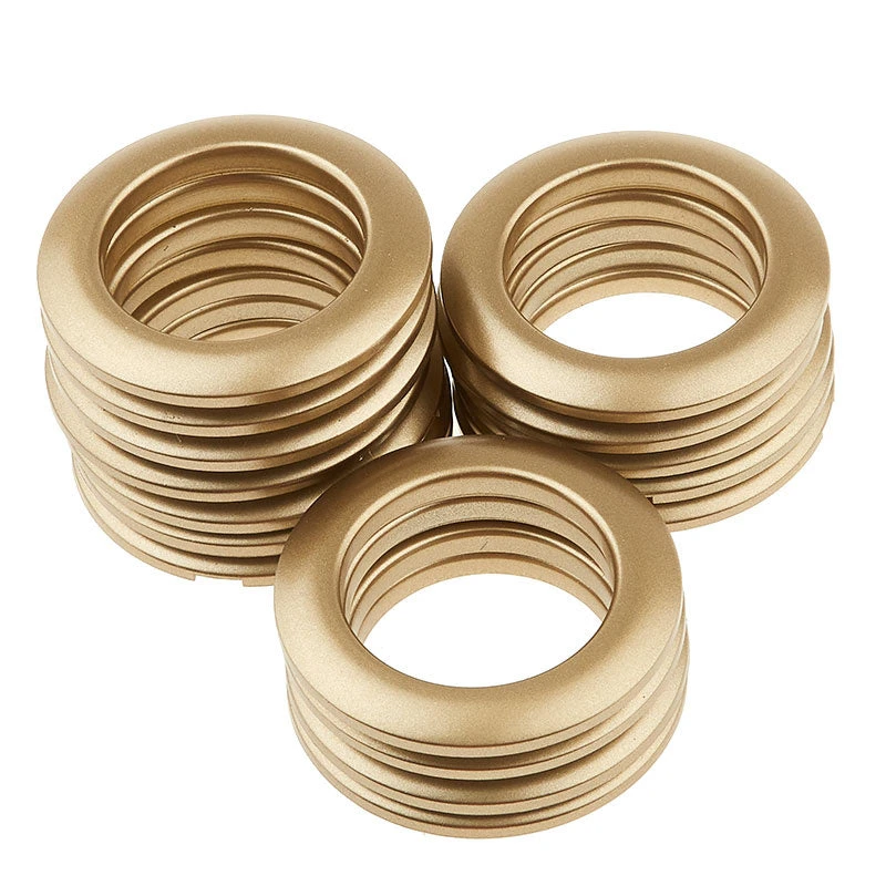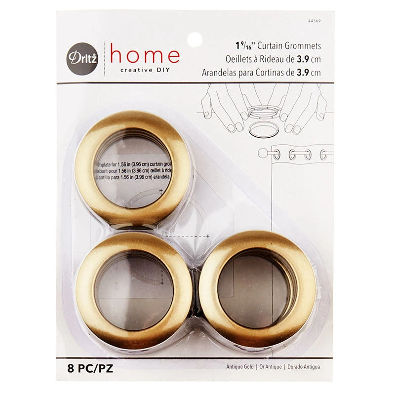 Eight gold plastic grommets that just snap together, no tools needed. Perfect for holding up quilts or even making bags! The only limit to these small wonders is your imagination. Size 1 9/16″ interior diameter and 2 3/8″ exterior diameter.