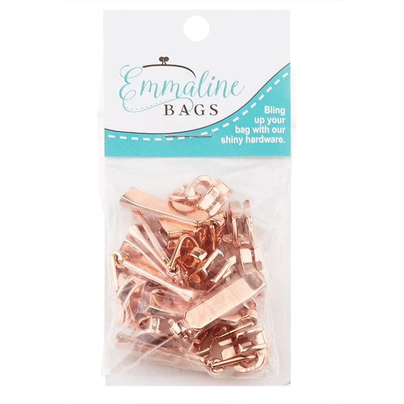 These Emmaline, rectangle, #5 zipper sliders and pulls are designed for the Emmaline #5 Zipper-by-the-Yard zippers! This pack includes 10 sliders and pulls in copper.