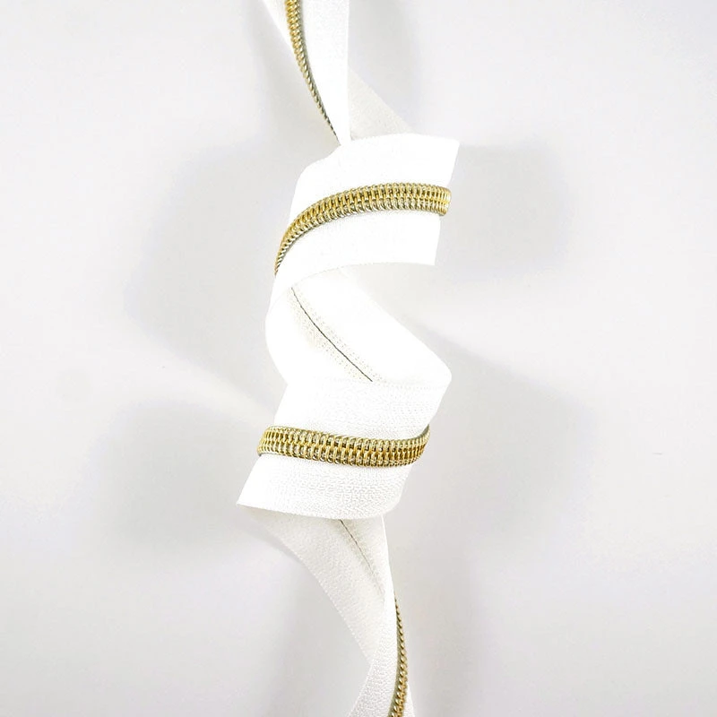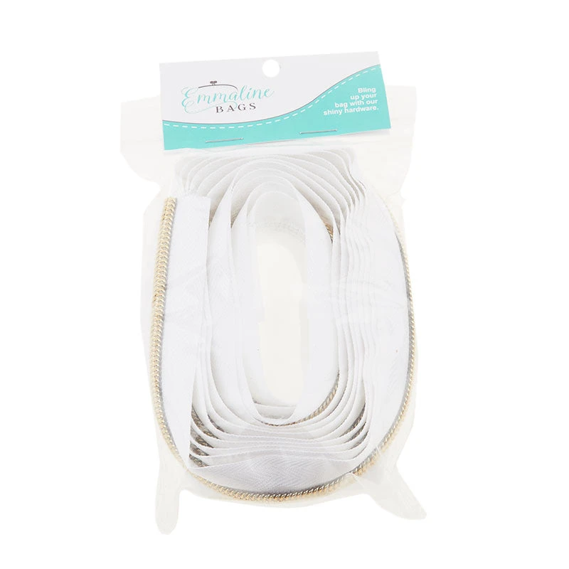 3-yard roll of a white nylon and gold zipper. The #5 nylon coil zippers from Emmaline Bags are perfect for areas where you want a heavier zipper, such as bag openings or side pockets. Tip: you can make double zippers by adding two zipper pulls in either direction! #5 Zipper sliders and pulls sold separately.
