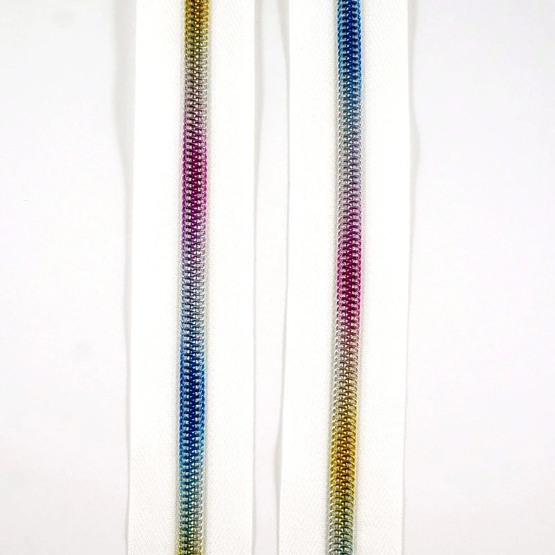 3-yard roll of a white nylon and rainbow zipper. The #5 nylon coil zippers from Emmaline Bags are perfect for areas where you want a heavier zipper, such as bag openings or side pockets. Tip: you can make double zippers by adding two zipper pulls in either direction! #5 Zipper sliders and pulls sold separately.