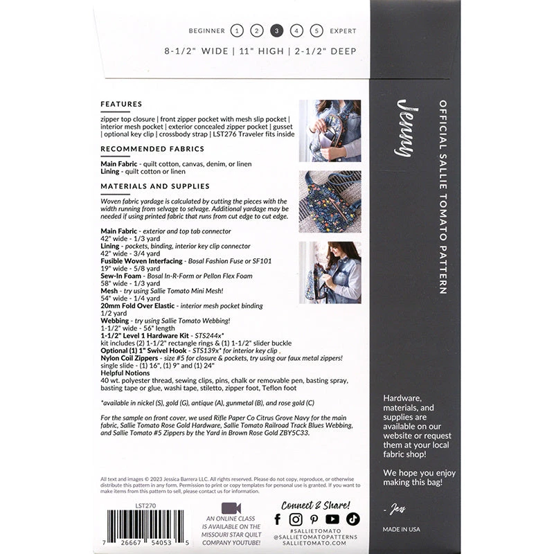 Ready to make your first Jenny Crossbody bag? This modern mini sling is simply darling and perfect for any occasion! The kit has everything you need to get started! Pattern, exterior and interior fabrics, fusible interfacing, sew-in foam, mesh, elastic, webbing, zipper and all the hardware – it looks like you’re all set to make this comfortable Jenny-inspired bag! Fun fact: Jenny Doan collaborated with designer Jessica Barrera to create this sling! You can watch their tutorial to follow along as you make it! The bag features a front zipper pocket for your phone or essentials, an interior mesh pocket, and an optional key clip. The Traveler bag also fits perfectly inside!