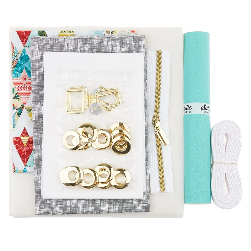 Kit includes pattern, outside fabric, robin egg pebble faux leather, lining, interfacing, sew-in foam, white cotton webbing, white and gold zipper and all the hardware needed in a gold finish.