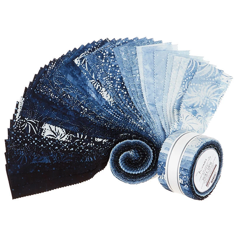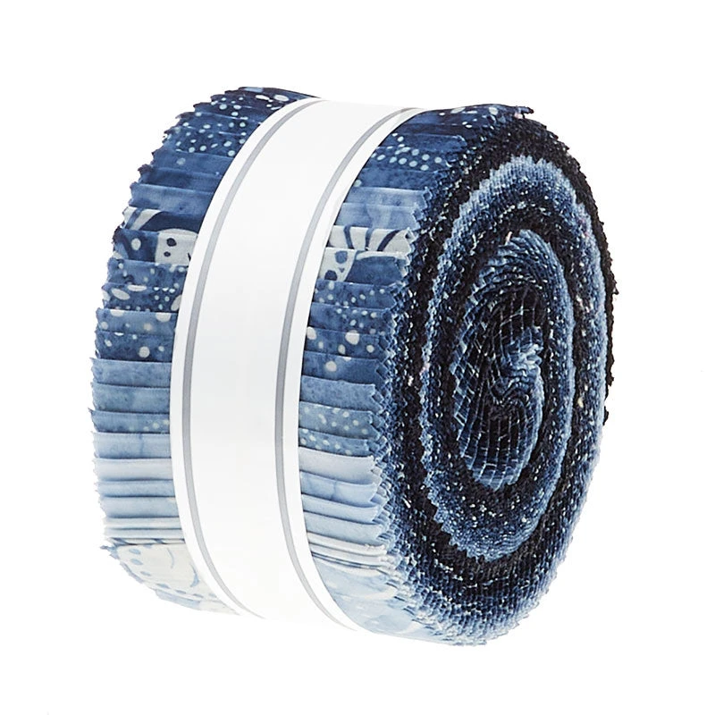 Blue 2.5″ batik strips of florals and foliage. “Kasuri” is actually a Japanese term for fabrics woven with fibers dyed to create patterns and images within the fabric, which is exactly what you’ll see in this collection! Kasuri by Lunn Studios for Robert Kaufman Fabrics is a gorgeous assortment of batiks in various shades of blue, featuring all sorts of mesmerizing prints.