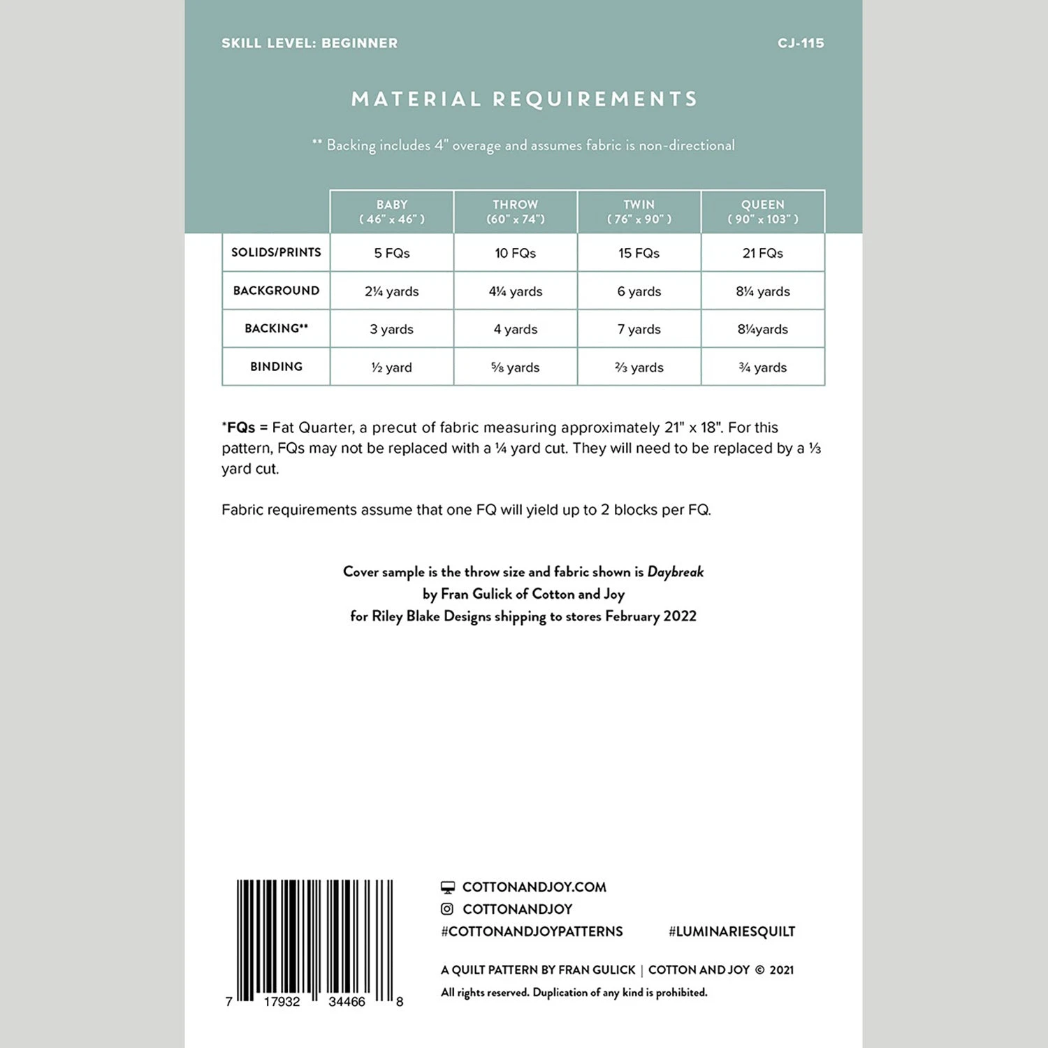 This quilt will light up a room! The geometric design of Luminaries shines, particularly when the quilt is made with solid colors. It is a fun mix-and-match pattern, great for the confident beginner. This block-based pattern from Cotton and Joy is fat-quarter-friendly and the perfect pattern to try whether your tastes are traditional, modern, or somewhere in between. Pattern includes helpful diagrams and detailed instructions.
