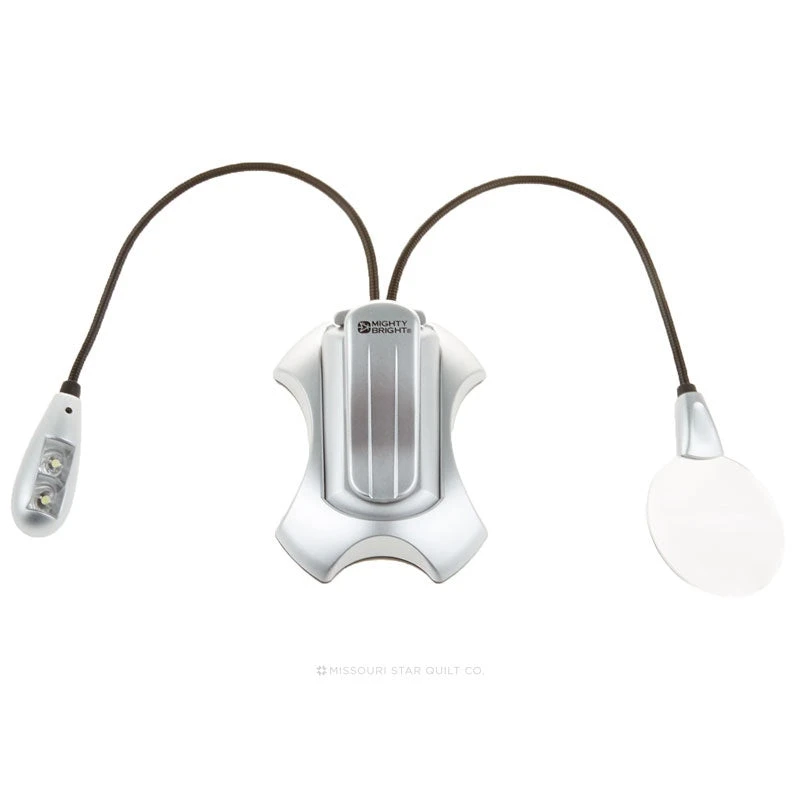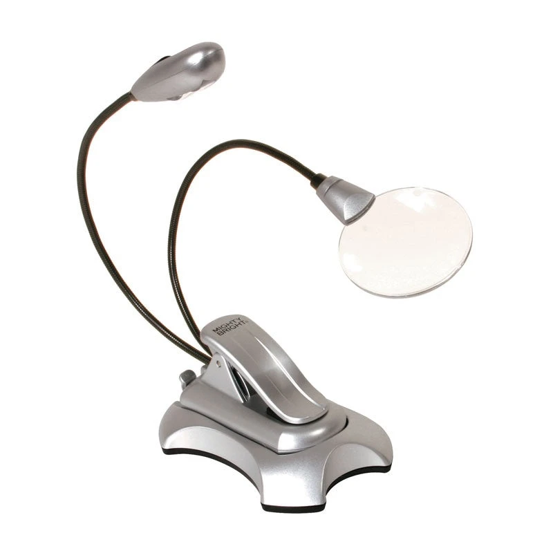 Two for one! Light and magnification. Two energy-efficient LED light with two brightness settings. 2″ lighted magnifier with 2X magnification. Base features rubber stoppers, large magnet and detachable clip, perfect for hoops and frames. Two flexible necks. Includes three AAA batteries.