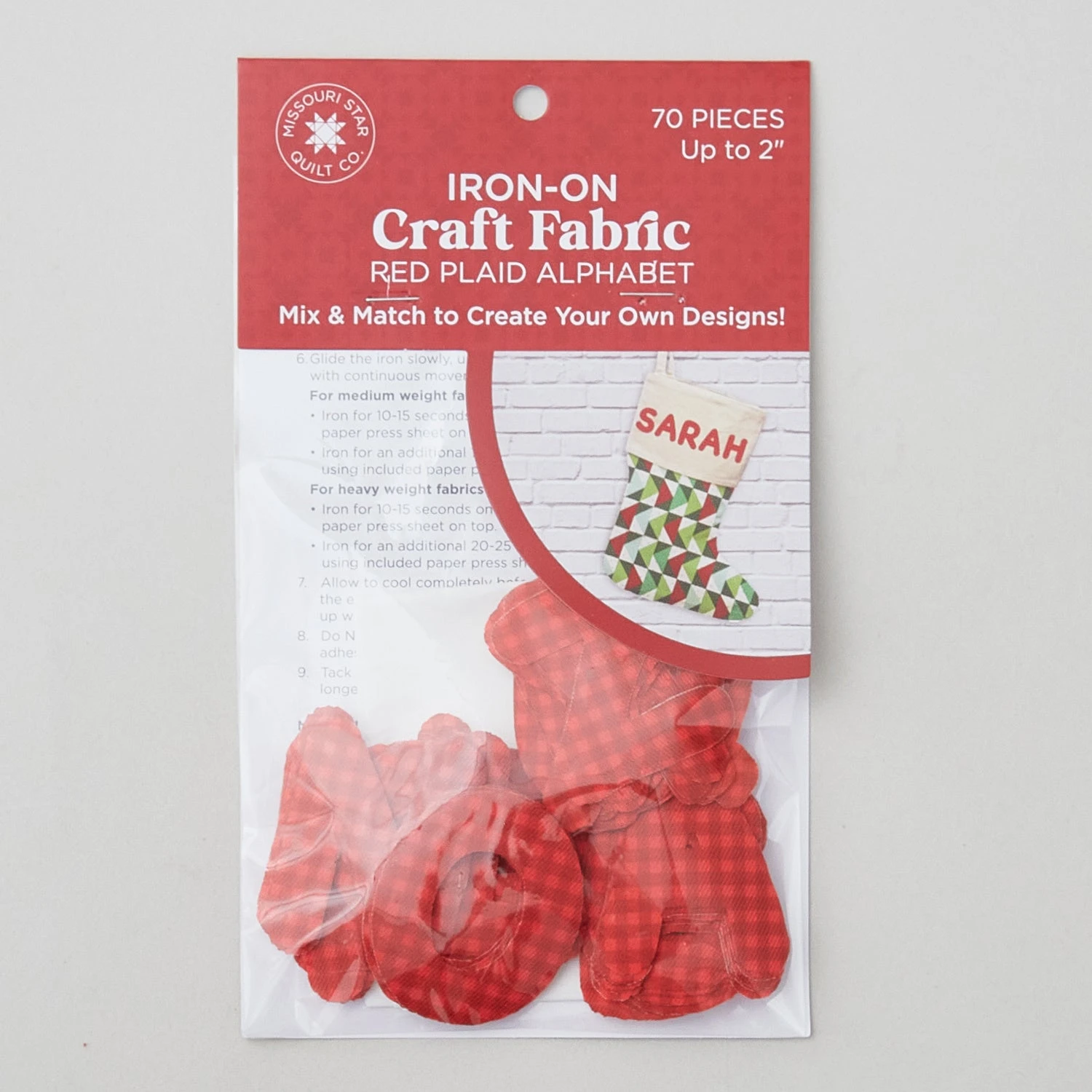 Iron-on letters in Christmas red plaid. Decorate for Christmas the easy way with Missouri Star Iron-on Fabric Christmas Red Round Alphabet. No sewing required! These letters are perfect for quickly personalizing stockings or adding a holiday phrase to pillows, fabric gift bags, totes, and so much more. Each package contains 70 polyester letters approximately 2″ in height.