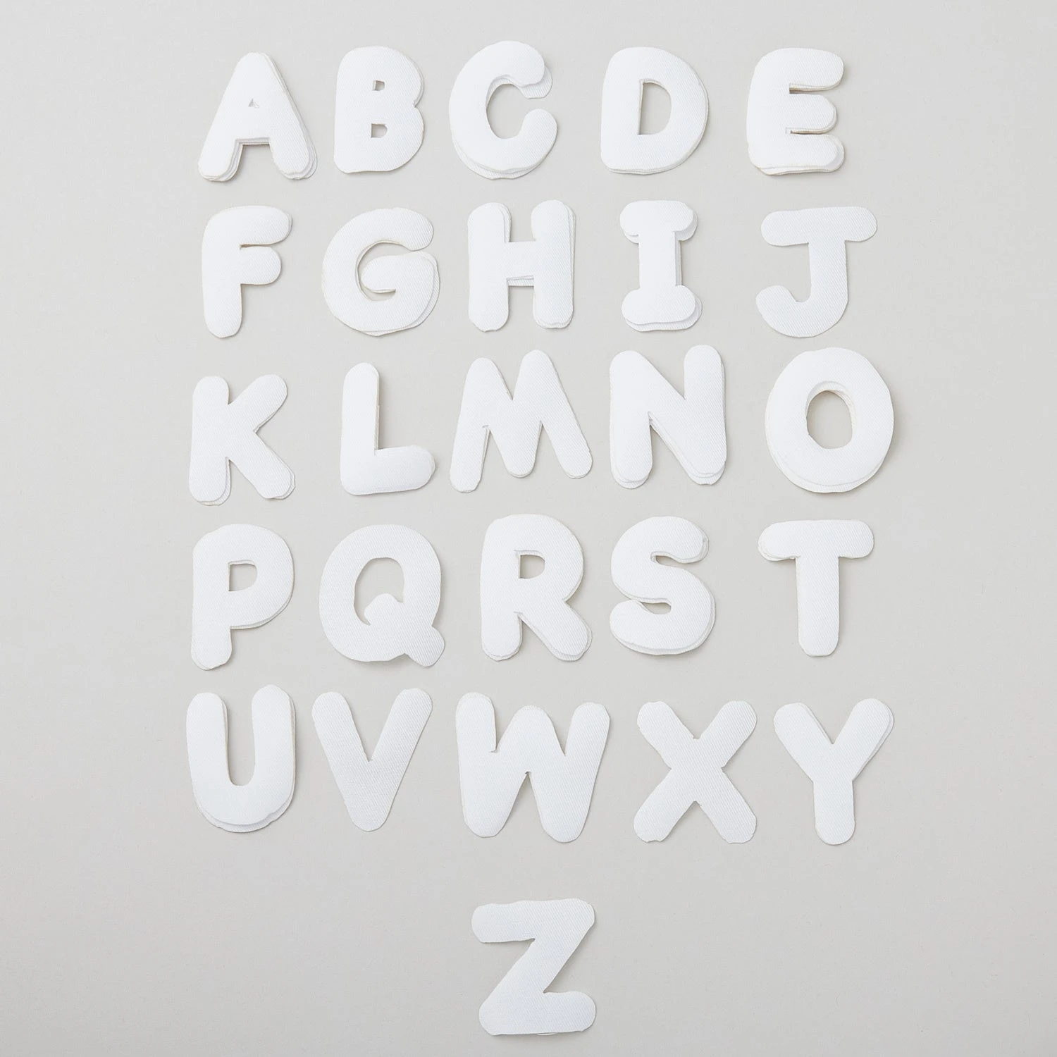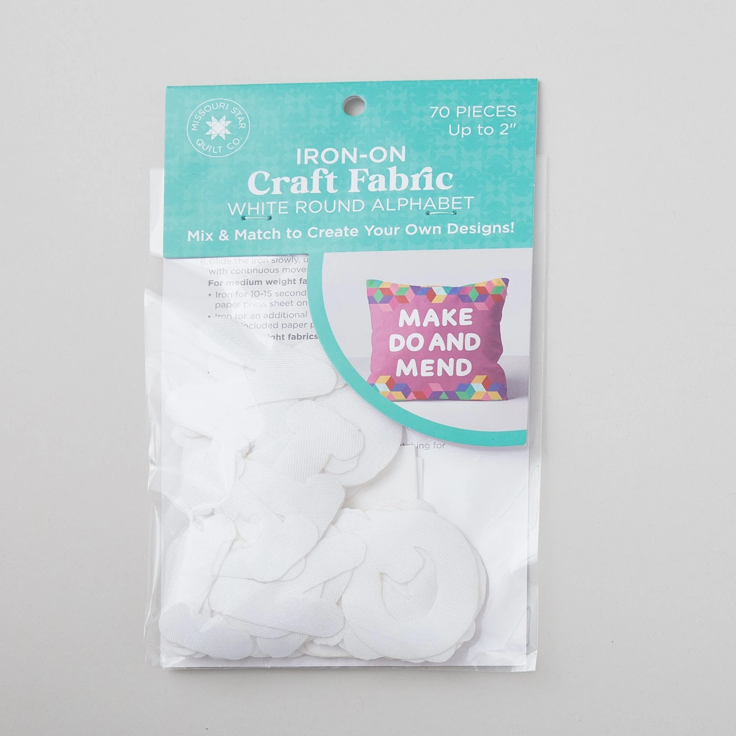 Iron-on white letters. Decorate the easy way with Missouri Star Iron-on Fabric White Round Alphabet. No sewing required! These letter shapes are perfect for quickly personalizing any fabric item or adding a message to pillows, totes, and so much more. Each package contains 70 polyester letters approximately 2″ in height.