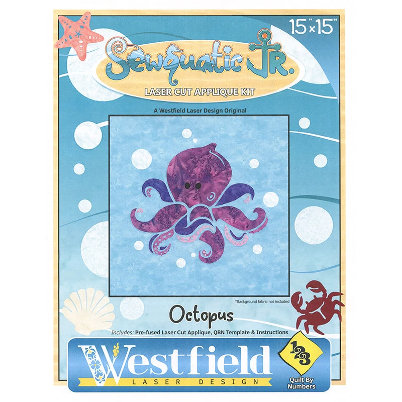 Designed with young ocean lovers in mind, the Sewquatic Jr. designs let you bring the colorful, wondrous creatures from the sea and shore into your home. The octopus kit contains a pattern, quilt-by-numbers template and precut pre-fused laser cut shapes. You supply the background fabric, the binding and backing for this project. Be sure to visit the other kits in this series- you will want to make them all!