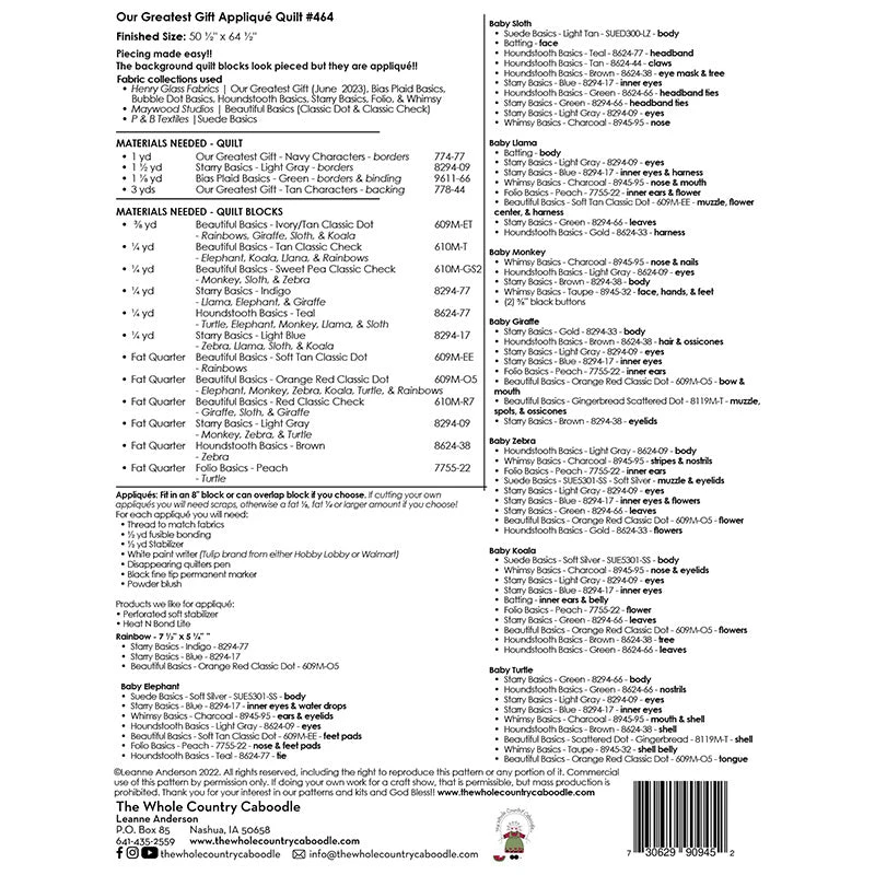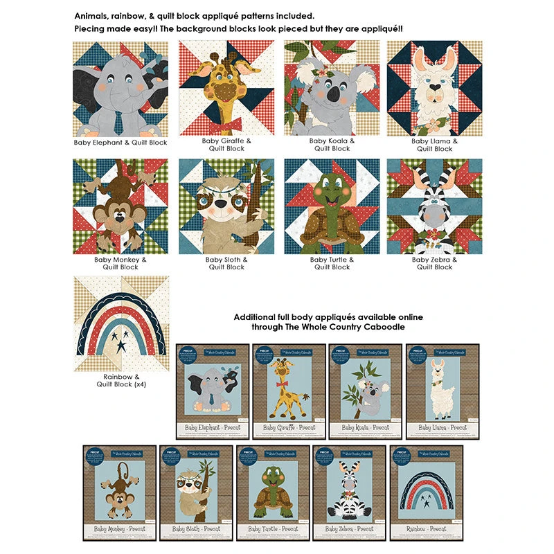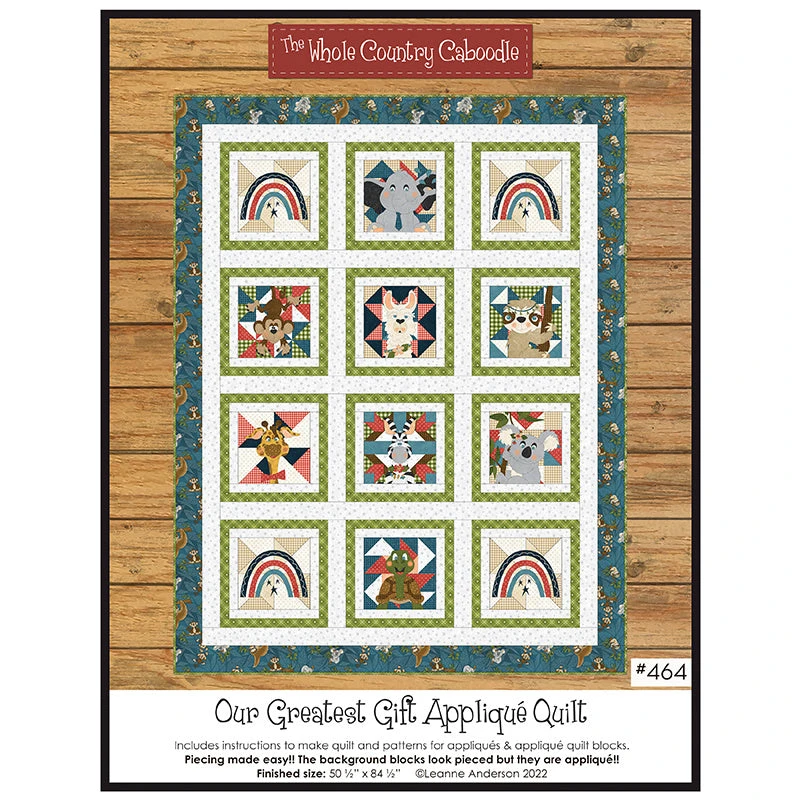 Get the look of pieced quilt blocks without the piecing! This adorable Our Greatest Gift pattern from the Whole Country Caboodle provides instructions and patterns for appliqués and appliquéd quilt blocks. Assemble the eight animal blocks and four rainbows to make a 50-1/2” x 64-1/2” quilt. This would make a touching gift to celebrate a rainbow baby. Use the CutterPillar Glow Basic Light Board and Cutting Mat and the Missouri Star Wooly Betty Board to help create professional results when cutting and pressing your appliqué pieces.