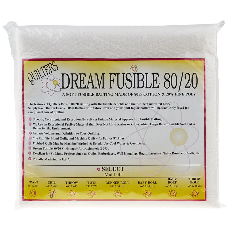 Quilter’s Dream Fusion is an 80/20 cotton and poly blend that is “infused” with soft fusible fibers, eliminating the need for pinning and basting. Solvent-free, may be machine washed and dried, or dry cleaned. Stitch up to 8″ apart.