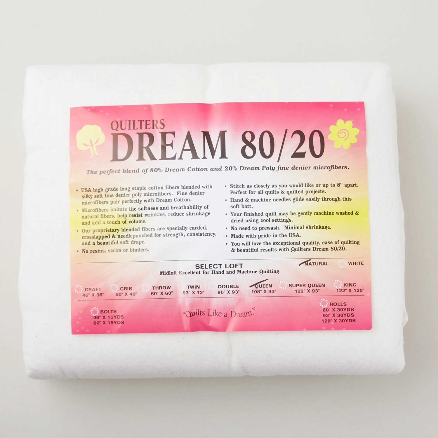 Livin’ the dream! Soft and silky Quilters Dream 80/20 batting is the perfect blend of 80% cotton and 20% polyester for a beautiful drape that breathes well. The long staple cotton fiber reduces shrinkage with added stability for stitches up to 8” apart. The proprietary blended fibers are specially carded, cross-lapped, and needle-punched with no scrims, glues, or other binders to resist the needle. Hand or machine quilt with ease!