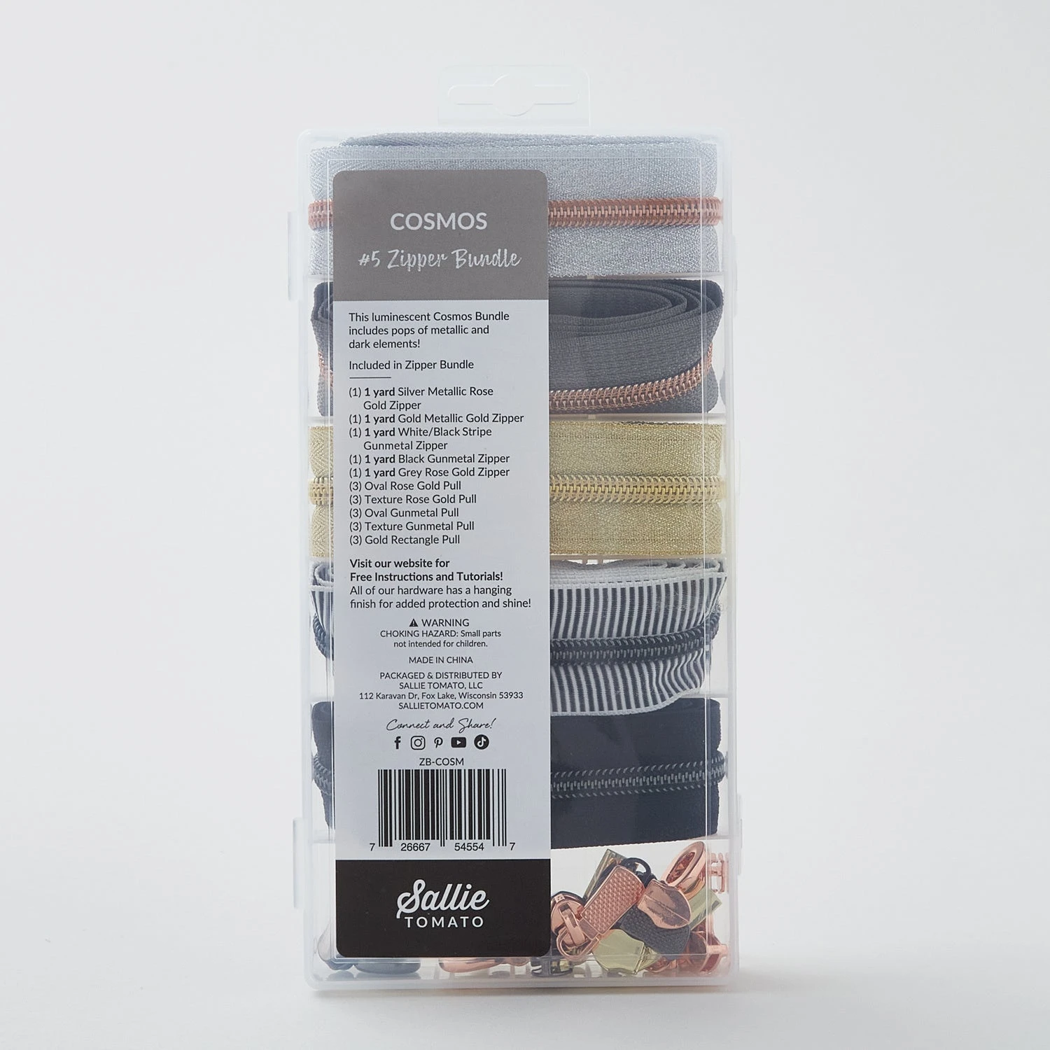This fun zipper bundle from Sallie Tomato is great to have on hand when you need a zipper with cosmic flair! Zipper bundle includes five 1-yard lengths of #5 zipper tape and 15 zipper pulls: three rose gold oval, three rose gold texture, three gunmetal oval, three gunmetal texture, and three gold rectangle. You can easily cut and sew through the nylon teeth to get the length you need!