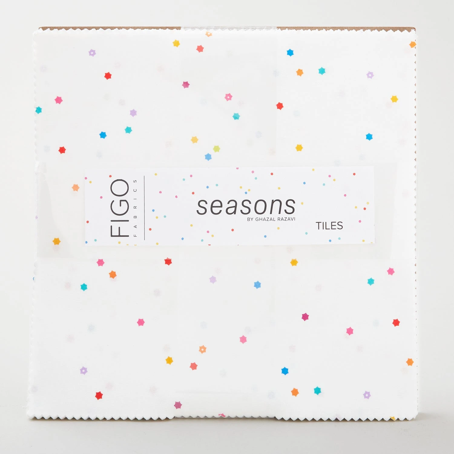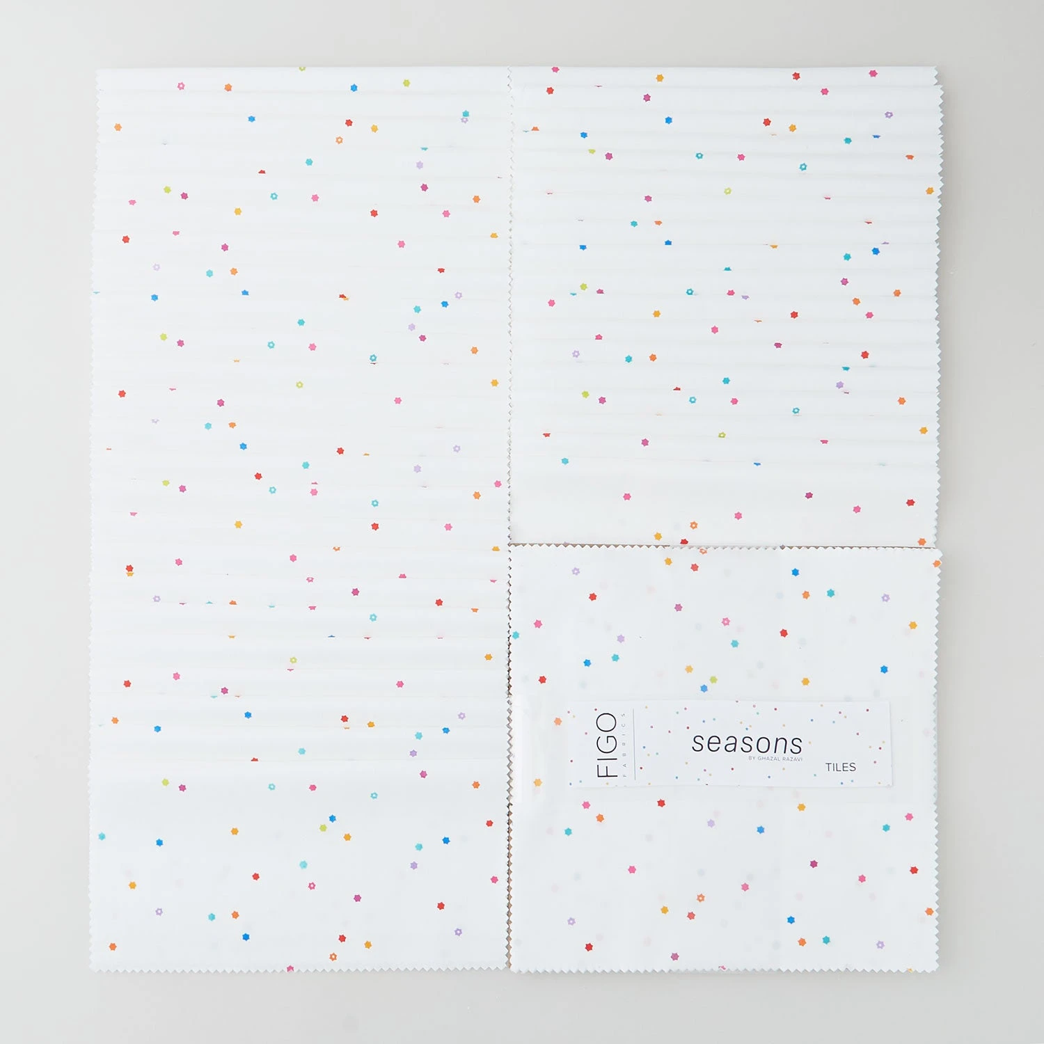 Layer cake of multicolored star-like flowers tossed on a white background. Seasons change, but the appeal of the Seasons collection from Figo Fabrics will last forever! Designer Ghazal Razavi created fabrics with speckles, dots, abstract flowers, and cascading lines in colors for all seasons. Work one or more of these perennial prints into your next project.