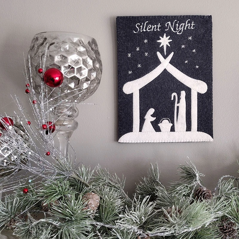 Your holidays will be calm and bright all season long with the Silent Night Quilt Kit. Designed by Rachel’s of Greenfield, this whimsical, winter, wool felt wall hanging features a silhouetted Nativity Scene appliquéd on a dark navy blue background. Kit includes instructions, wool felt, templates, cotton floss, and a bonus ornament.