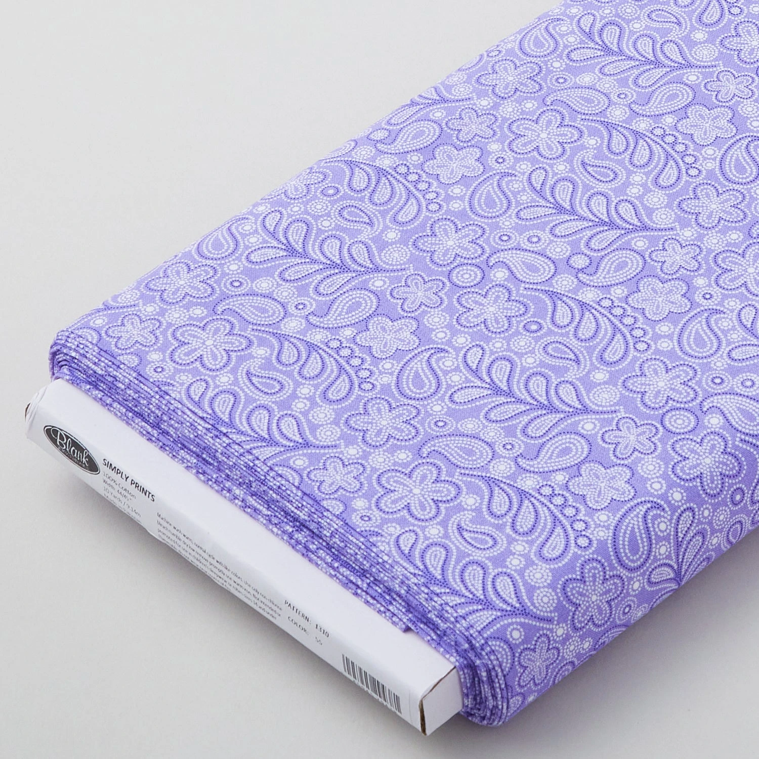 A 10-yard bolt of purple and white flowers and paisley on a purple background. Whether you’re looking for ditsy daisies or magnificent mosaics, you’ll find them by the bolt in the Simply Prints collection from Blank Quilting Corp. These bolts of prints, which come in a wide array of colors, are perfect for pieced backings on large quilts.