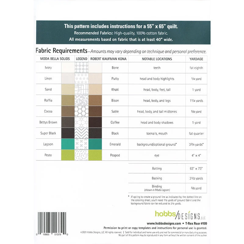 If you know a little one who is all about the dinos, then he or she will love this rawr-some quilt! The T-Rex Roar Quilt Pattern by Hobbs Designs features a ferocious paper-pieced tyrannosaurus rex. This is a foundation paper piecing pattern that includes full-sized templates and detailed panel assembly diagrams for a 55″ x 65″ quilt.