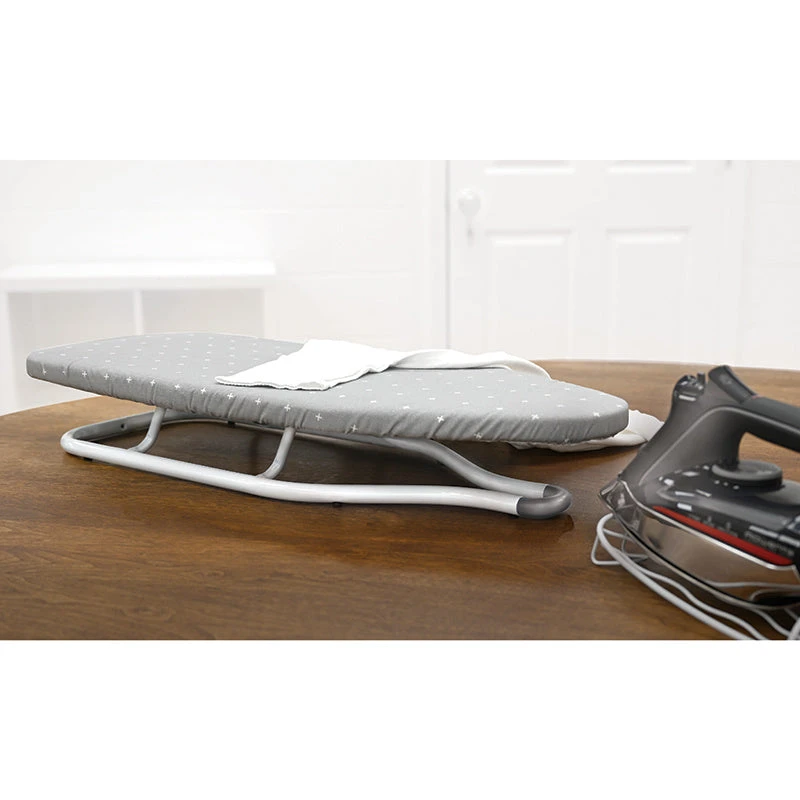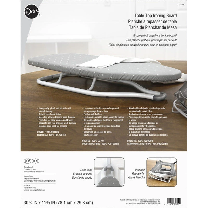 Board of your old ironing station? Press your luck with a handy, table-top ironing board from Dritz! Perfect small spaces, this ironing board folds flat for storage. Features a heat-reflective padded cover, wire mesh top for steam to pass through, detached iron rest, and door hook for hanging storage. It’s everywhere you want to be!