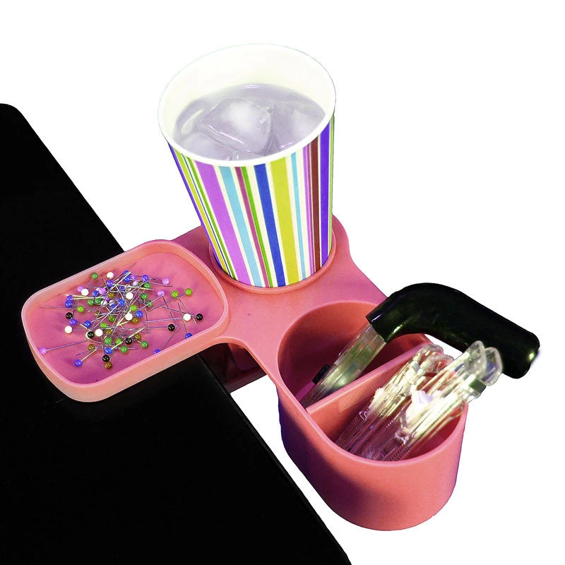 Clip onto any table top or sewing machine table. Features a pin tray, cup holder, two storage bins with removable divider.