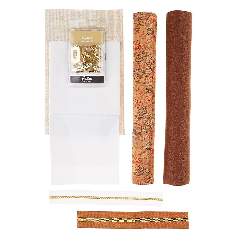 Ready to make a fashionable travel bag? This organized bag is just the right size to securely fit your travel necessities, making it perfect for frequent travelers! The kit has everything you need to get started! Pattern, postage stamp cork, brown faux leather, lining, fusible interfacing, vinyl, two sizes of zippers and all the hardware – it looks like you’re all set to make this beautiful travel companion bag! Fun fact: the bag features a passport holder, ID pocket, exterior slip pocket, an interior zipper pocket, and card pockets.