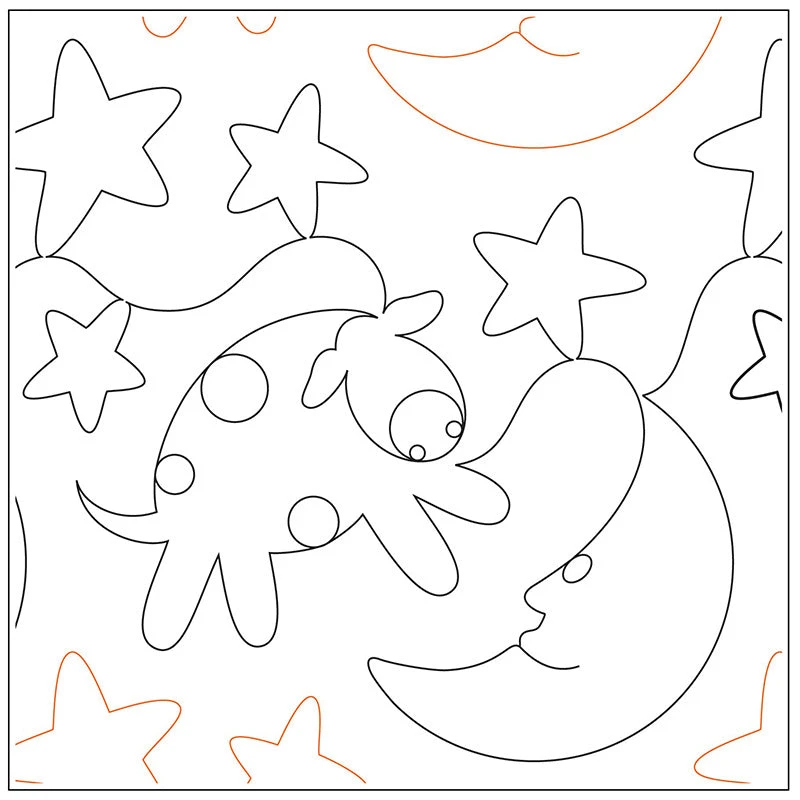 Finish your baby quilt with the perfect stitching! The Over the Moon pantograph from Urban Elementz features a sweet cow jumping over the moon and stars, perfect for a baby quilt. Paper pantograph roll for longarm quilting featuring the “Over the Moon” design.