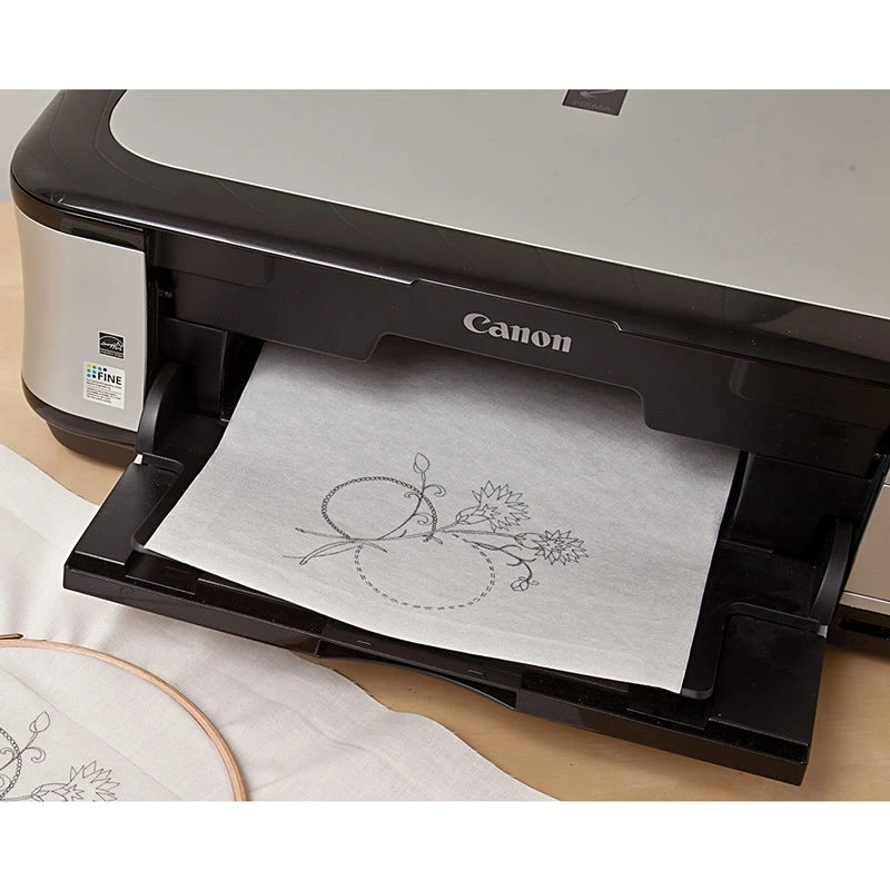 Water-soluble, adhesive-backed sheets perfect for embroidery, machine quilting, crazy quilting, appliqué, and more. Print, copy, or trace your design on to a sheet next stick it down, position (or reposition) on your fabric and stitch right through it then just wash it away…the printed paper dissolves easily in water without damaging your work.