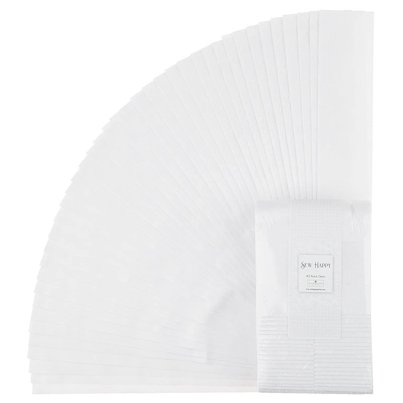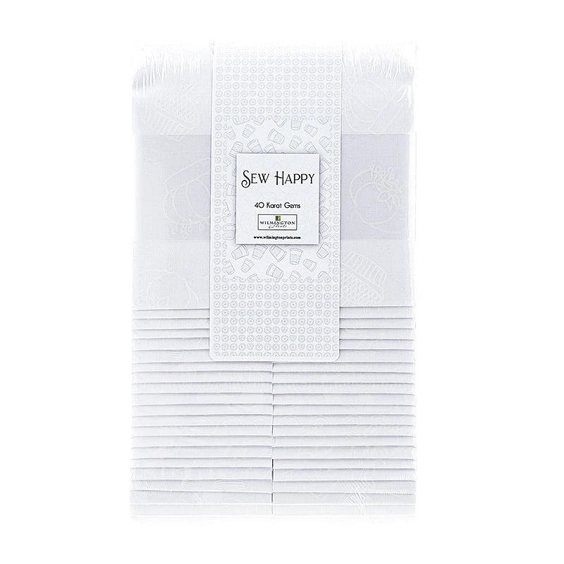 40 Karat Gems in assorted white sewing-themed prints on a white background. Fabrics so pretty, you’ll hoard them forever! Show off your love of sewing with Wilmington Essentials – Sew Happy. This versatile collection by Wilmington Prints features white-on-white sewing motifs like scissors, pin cushions, needles, and thread spools. These prints make adorable blenders and background fabrics, giving a subtle nod to the hobby you love SEW much!