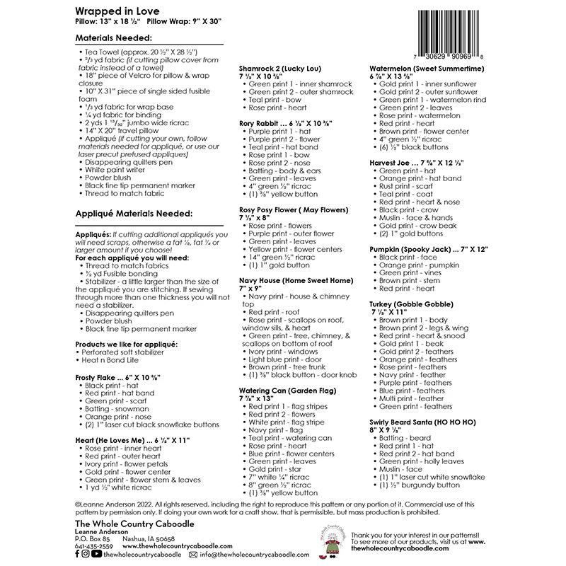 Pillows for every season! Show off your festive spirit with 12 pillows–one for every month. Each pillow has a design that corresponds with a holiday or celebration for each month. This fun pattern includes instructions for pillow wrap & cover along with 12 appliqué templates and layouts.