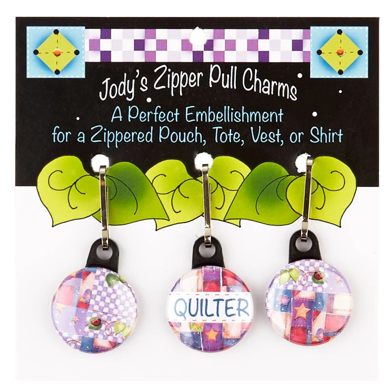 Zipper pull charms are the perfect embellishment for a zippered pouch, tote, vest or shirt. Each pack includes a set of three zipper pulls in three fun quilt designs.